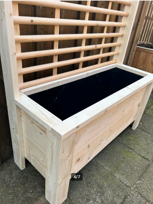 Plantenbak/bloembak gemaakt van onbehandeld , gedroogd en geschaafd steigerhout. De binnenkant is afgewerkt met landbouwplastic